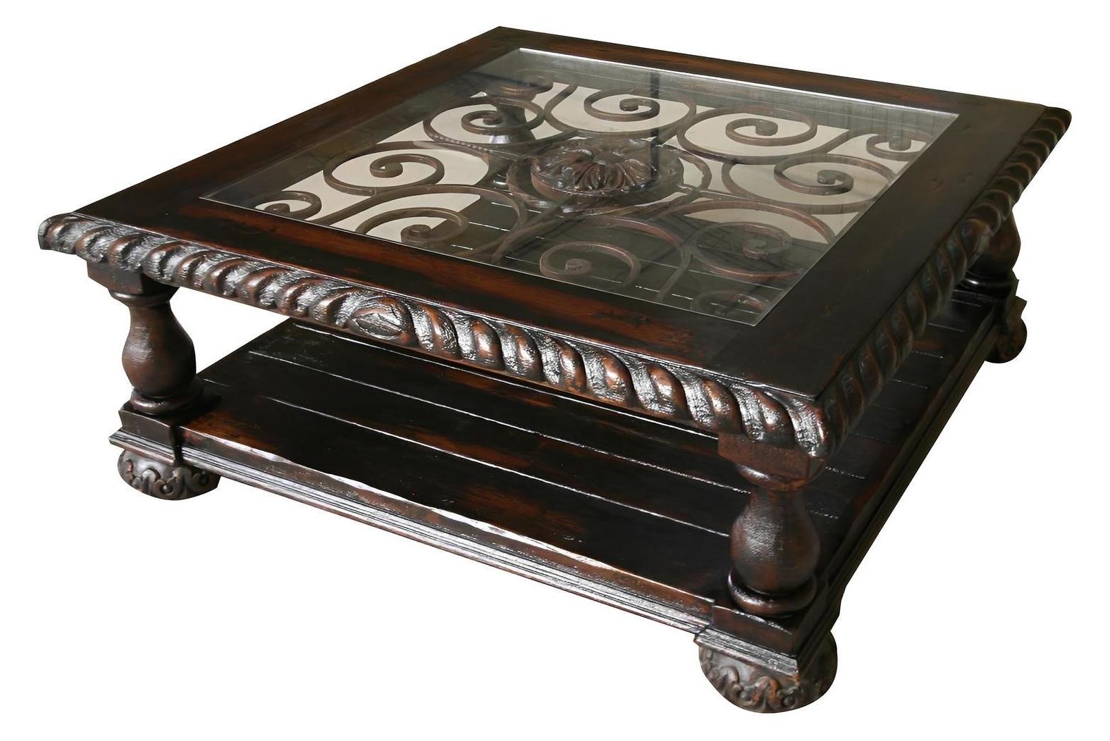- Glass-inset top showcases the decorative wrought-iron scrollwork beneath.