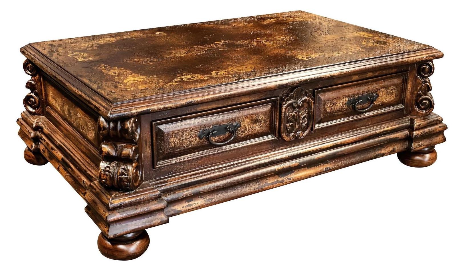 Quillan Coffee table - Rectangle, Antique Brown, Distressed Surface With Ornate Antique-Gold Floral Pattern