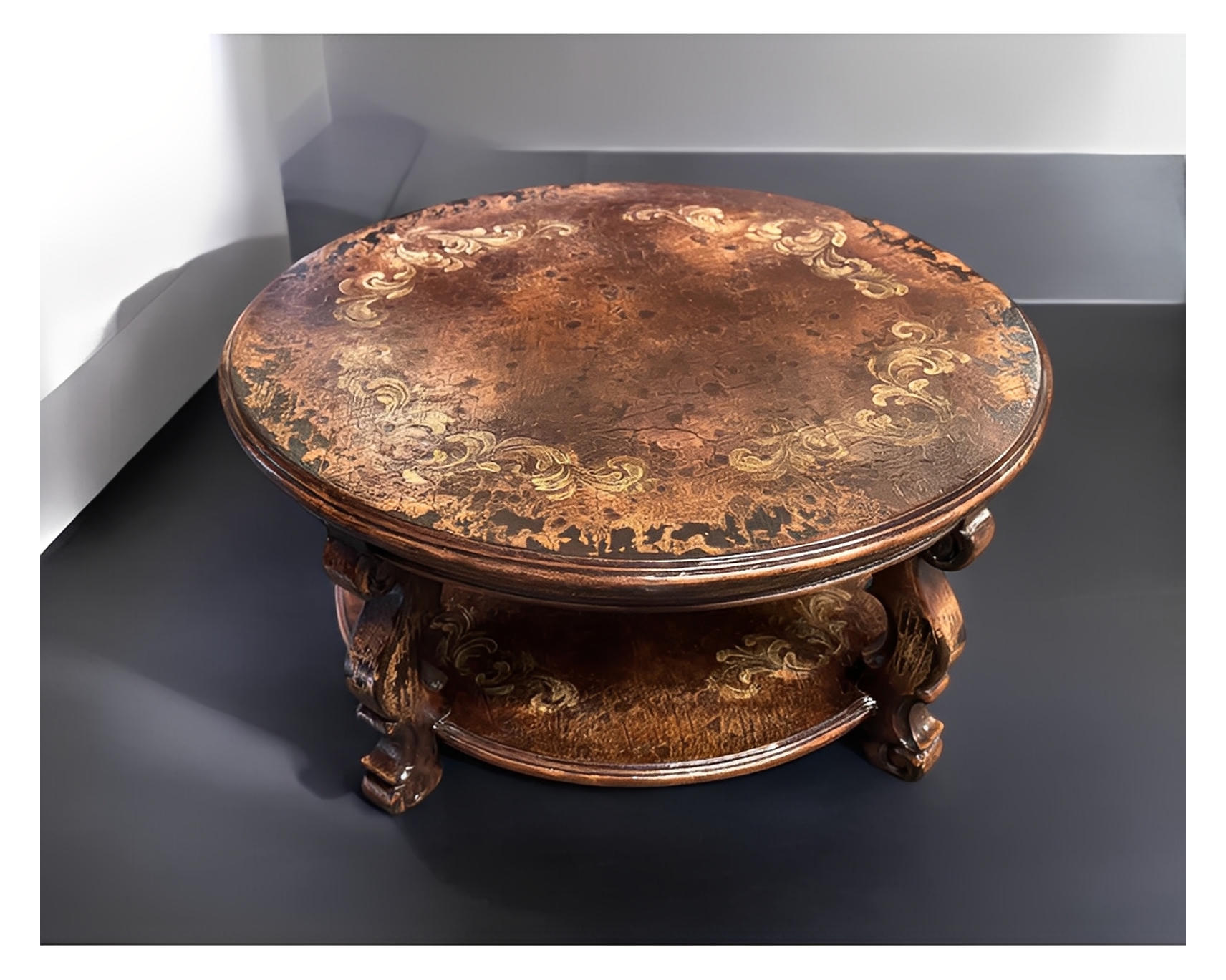 Rocamadour Coffee Table - Round, Antique Copper Brown, Two-Tier Round Shelves With Ornate Carved Legs