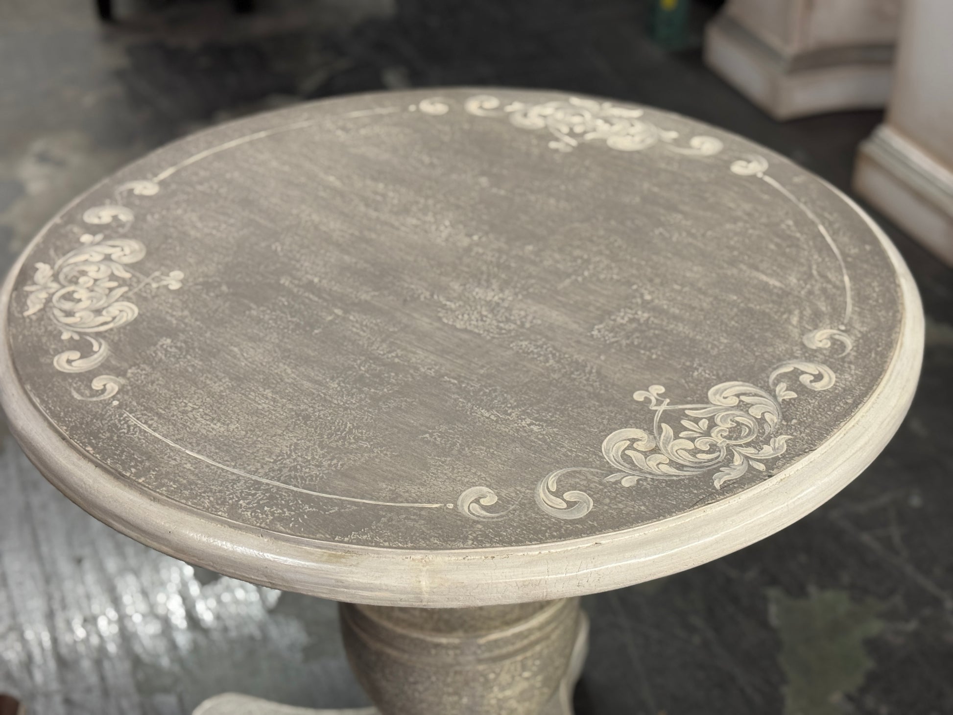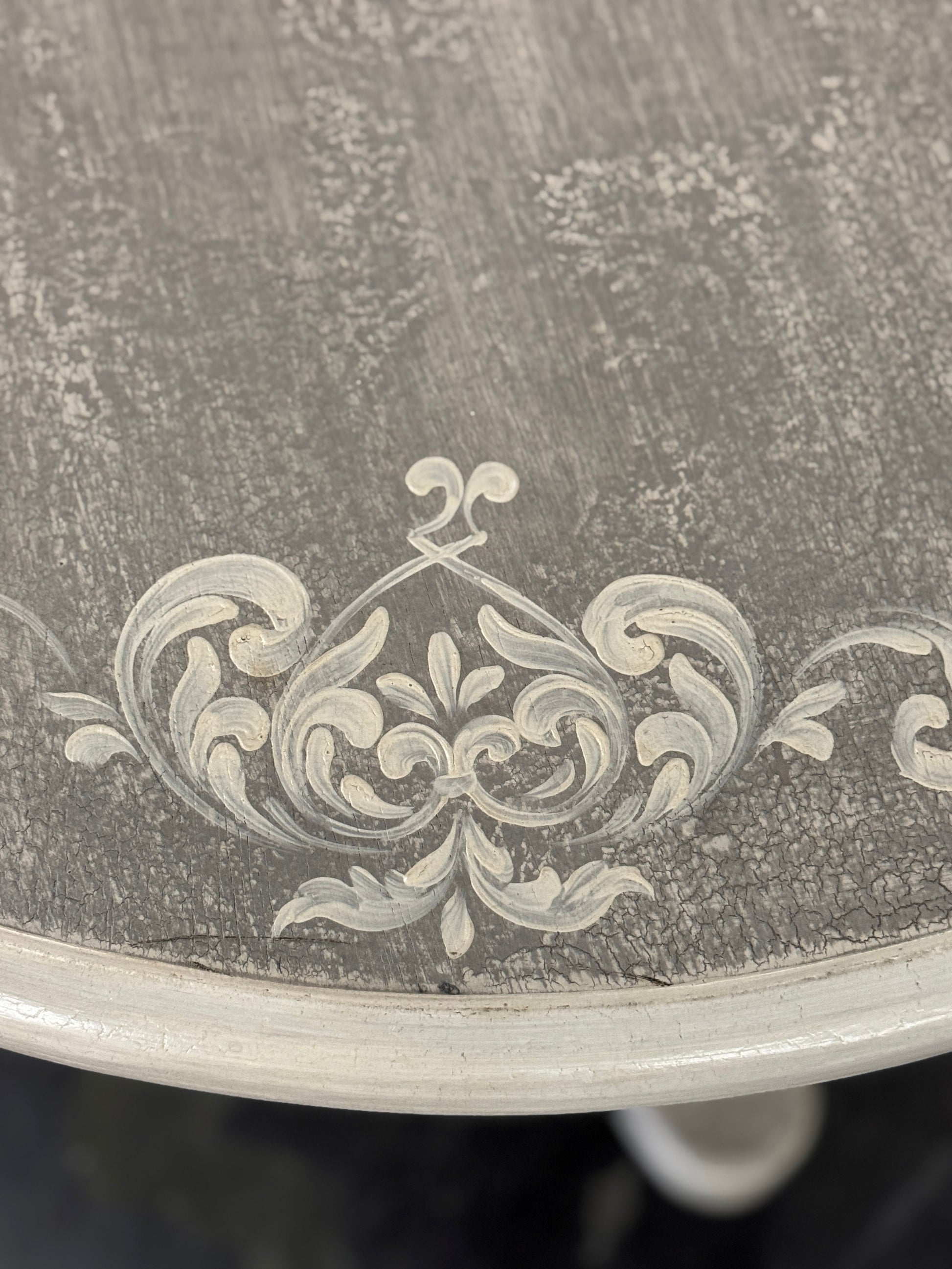 - Round top features a decorative edge with a subtle etched floral border