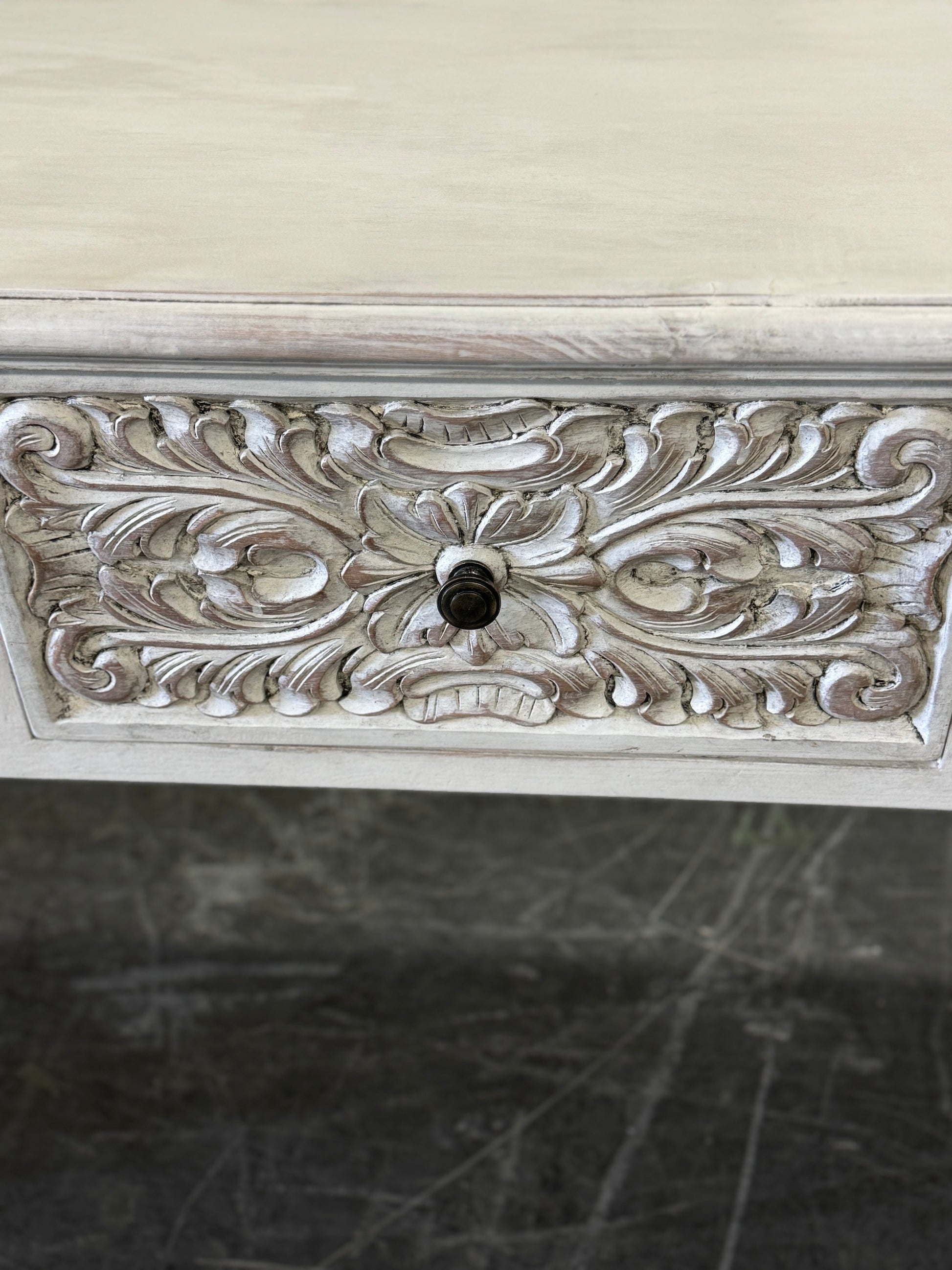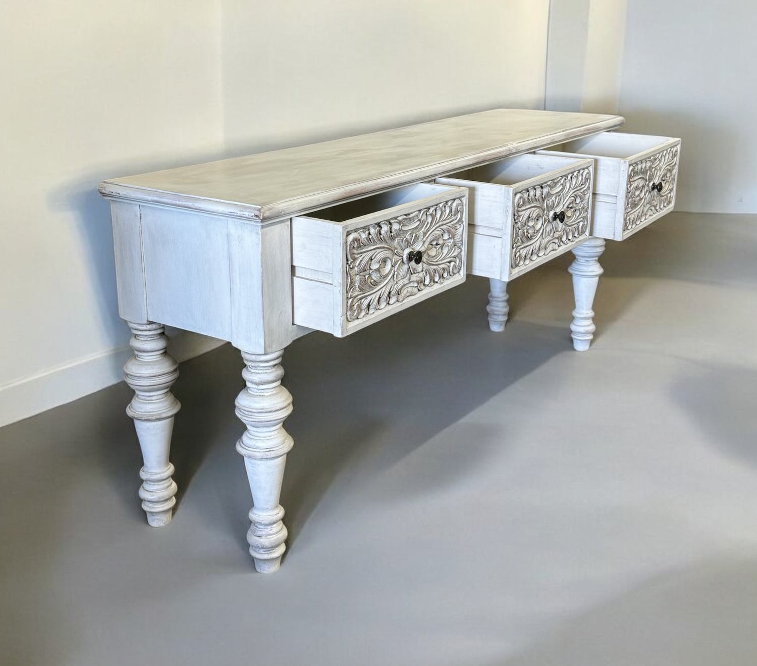 Saint-Léon Console Table, Whitewashed Distressed Finish, Three Ornate Carved Drawers