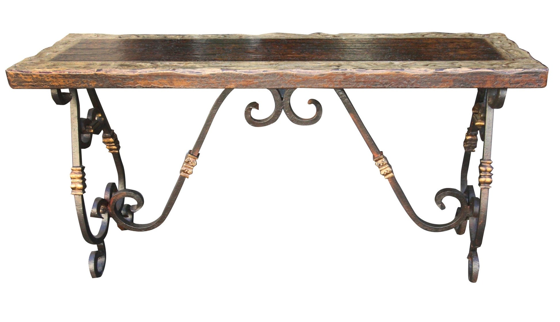 Saint-Malo Console Table, Rustic Brown Live Edge Wood Top, Hand-Forged Iron Scroll Leg Base