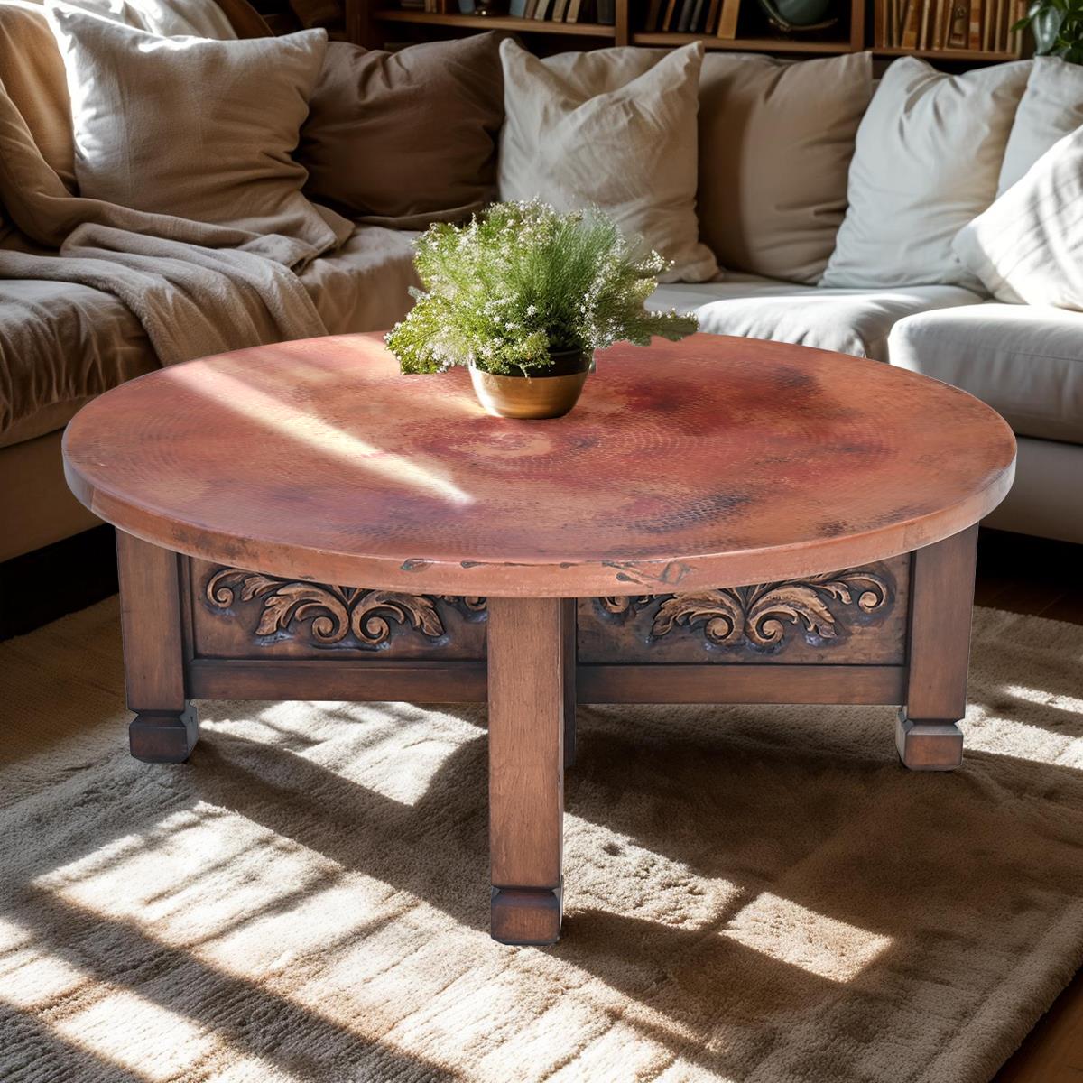 Add warmth and artisanal charm to your living room with the Sierra Vista Scroll Round Coffee Table. Featuring a hand-hammered copper top with a naturally aged patina, this round centerpiece blends rustic elegance with Old World craftsmanship. The solid wood base is richly carved with scroll details, offering timeless character and durability.