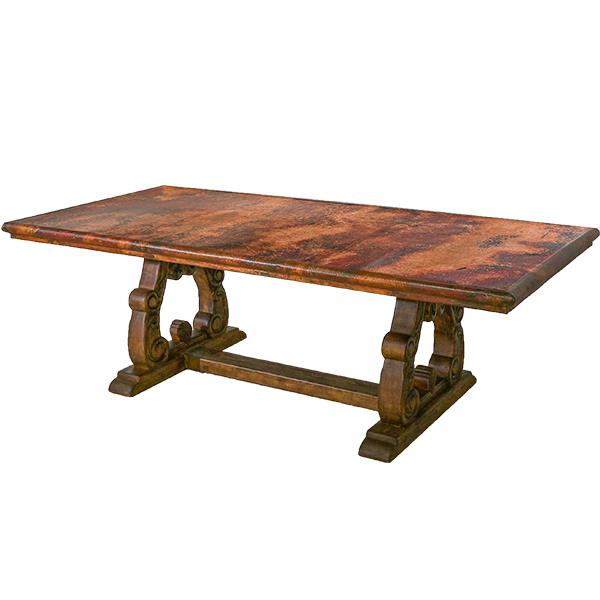 This striking dining table pairs old-world artistry with rustic sophistication. The rectangular tabletop is handcrafted from richly textured copper, showcasing a warm patina of earthy reds, browns, and subtle black undertones that develop unique character over time. Beneath, the solid wood trestle base features hand-carved scrollwork details, lending a stately and architectural presence to the design. Perfect for both grand dining rooms and refined rustic spaces, this table brings artisanal craftsmanship and timeless charm to any gathering space.