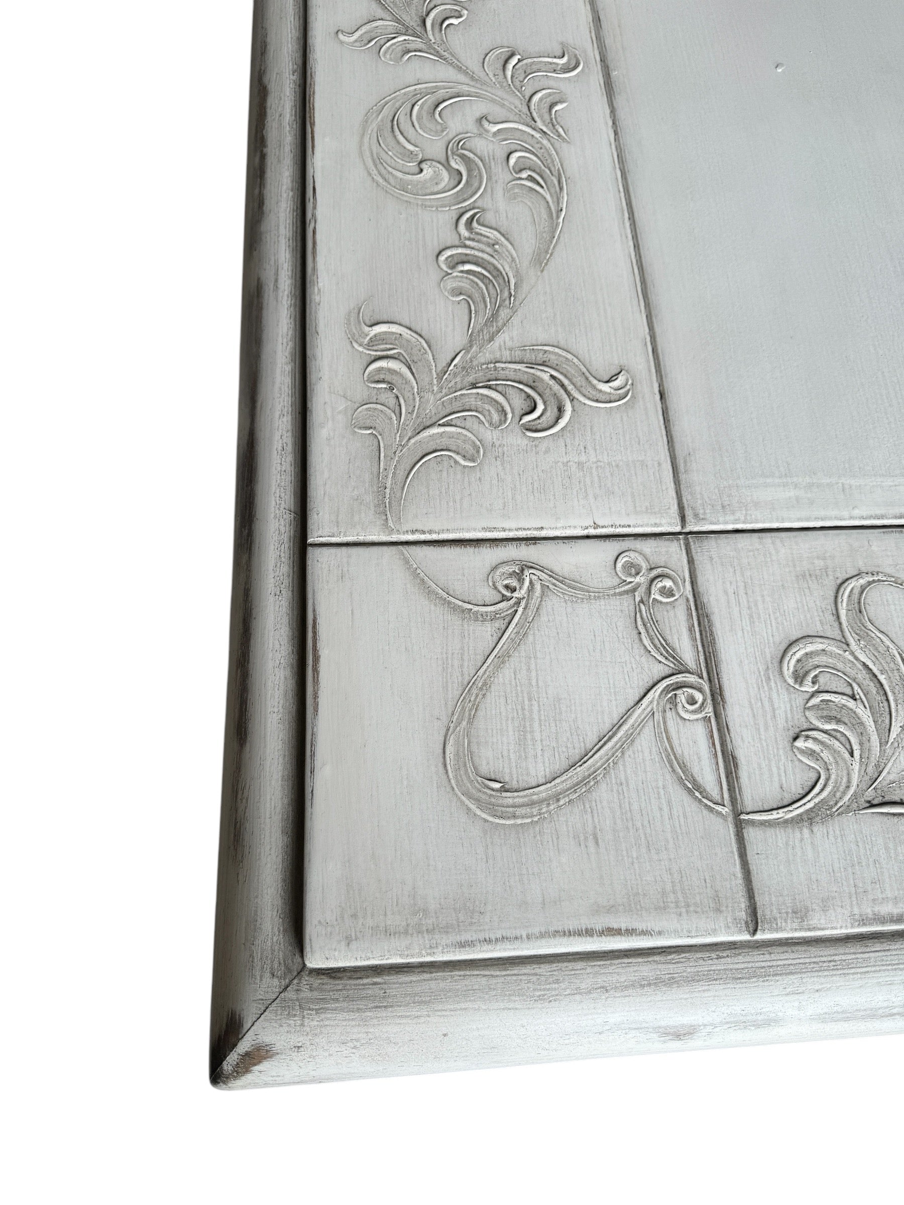 The Usson Dining Table is a rectangular centerpiece that blends rustic charm with refined detailing. Finished in weathered whitewash and supported by an ornate carved trestle base, it's built for entertaining and everyday family dining.