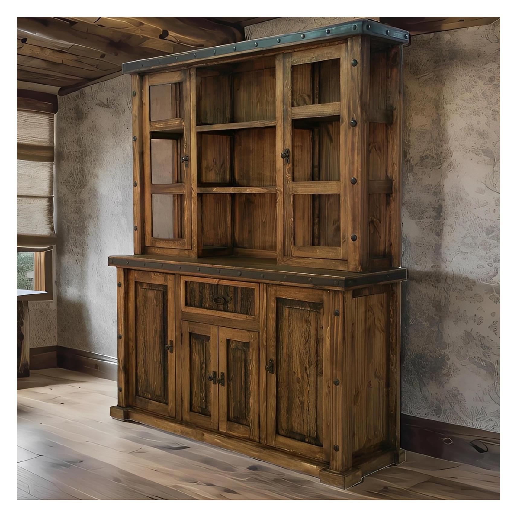 - Upper hutch with open shelving and glass-front doors for displaying glassware and keepsakes.